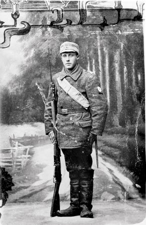 Johannes deltog i finska frihetskriget som kock. På bilden i stram givakt med rysk Mosin-Nagant Model 1891 med bajonett, patronbältet över axeln och pjäxstövlar på fötterna. Foto efter krigets slut i april 1918.