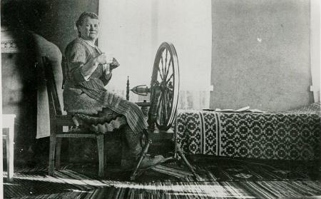 Fotografi av Irene Enegren med en spinnrock på sitt hemman i Näsbacken.