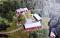 | Estrid Rodas med vimpeln som anger hemmanets grundande år 1742. | |