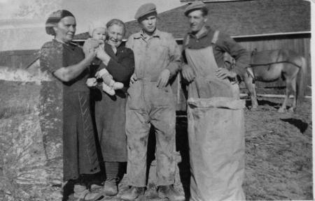 | Tvillingarna Yngve Roland i sin mor Siris Famn och Ida med Tage Vilhelm. Fotot taget 1950 vid Villis. | |
