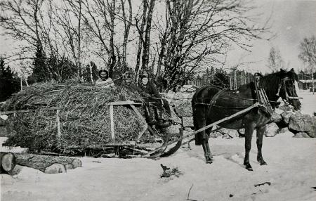 På fotografiet syns Ines Björkén gift Vesterlund och Rut Forth gift Martin som har fått skjuts av Nestor och hans häst Prima i Nestors höskrinda.