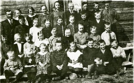 Stående från vänster, tredje raden: Erland Forth "Hermanes-Äland" född 1916. Greta Videll "Lärans-Greta" född 1915. Alice Granholm "Axelas-Alice" född 1916. Valdine Forth "Erkas-Valdine" född 1915. Anni Boij "Back-Anni" född 1916. Ole Forth "Hermanas-Ole" född 1916. Rafael Forth "Hanlaris-Rafael" född 1915.