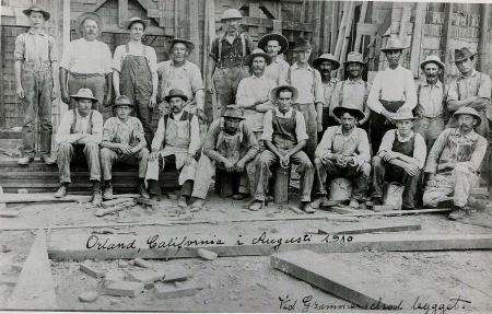 Detta är det enda fotografi som vi lyckats spåra av avlidne byggmästare Johannes Wikmans fotografisamling. Kortet har erhållits som gåva av Finlands ambassadör på Island Anders Hulden, som i sitt följebrev önskade oss god fortsättning i vårt viktiga arbete att forska i gångna tider. Johannes Wikman var född i Vikby år 1878 och utbildad byggmästare i tjänst hos Österbottens lantbrukssällskap. Han dog i Vasa 1956. Han vistades i USA åren 1906-1911 och på kortet sittande längst till höger och bas för ett arbetsgäng vid byggande av en skola i Orland, Californien i augusti 1910.