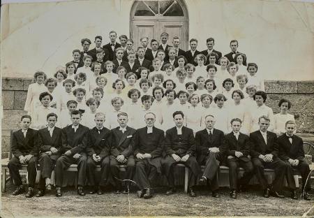 Tölbyungdomar som konfirmerades det året, Uppe i bild, Bror Enegren, Börje Köping, Lars Martin, Gösta Norrgran, Henrik Svarfvar. Till vänster bland flickorna Sonja Martin och Barbro Påfs, till höger Doris och Britta Enegren och sittande Karl-Johan Näs och Hans Påfs.