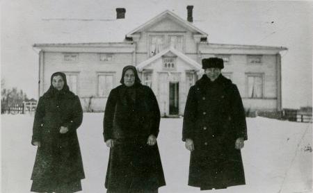 På gårdsplanen i vintermundering står från vänster: Ester Berg från Rimal, mångårig trotjänarinna vid "Olos". I mitten värdinnan Kristina Sofia "Olos-Fia", född Enegren år 1872, gift år 1895 med gårdens husbonde Johan Alfred Ehn, "Olos-Johannes" född år 1870, stående till höger på fotografiet.